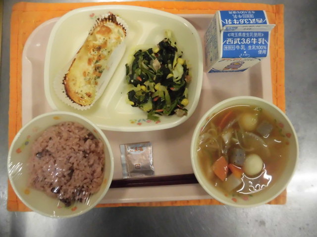 絵文字:食事 給食牛乳・赤飯・タラのマヨネーズ焼き・ほうれん草とコーンのソテー・重忠汁絵文字:食事 給食