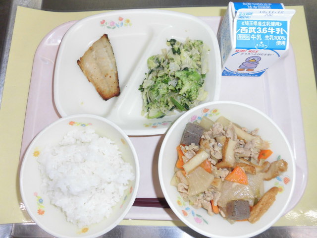 牛乳・ごはん・サワラの西京焼き・野菜のゴママヨネーズ和え・大根とぶた肉の煮込み