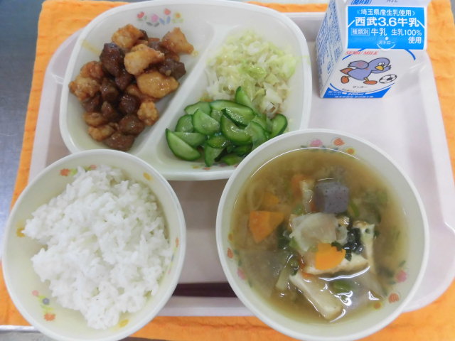 ★牛乳・ごはん・鶏肉とレバーのレモン煮・温野菜(和風ドレッシング)・野菜椀★