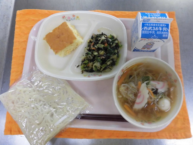 牛乳・しょうゆラーメン・オレンジパンケーキ・ほうれん草とひじきのサラダ