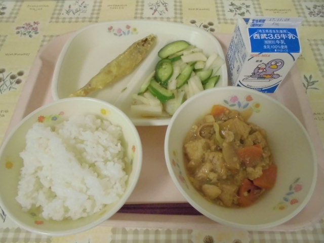 牛乳・ごはん・厚揚げのチャーサイ・スティック野菜・ししゃもフリッター