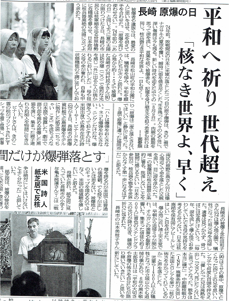 8/10埼玉新聞に関係の記事が出ていました。新聞の見出しには、平和への祈り、世代超え『核なき世界よ、早く』、「人間だけが原爆落とす」とでていました。記事の中で小6のコメントがあり「平和の大切さや原爆の恐ろしさを自分たちが語り継いでいきたい」、小2のコメント「戦争は絶対にしてはいけないとよくわかった」とありました。新聞記事クリック→ 010809 長崎原爆の日.pdf