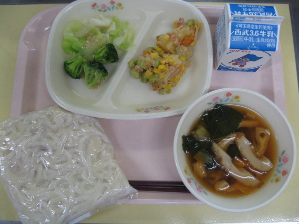 牛乳・五目うどん・カラフルポテト・サラダ