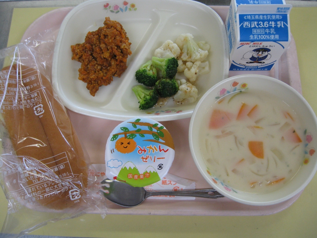 牛乳・スラッピージョー・花野菜のサラダ・花豆のポタージュ・みかんゼリー