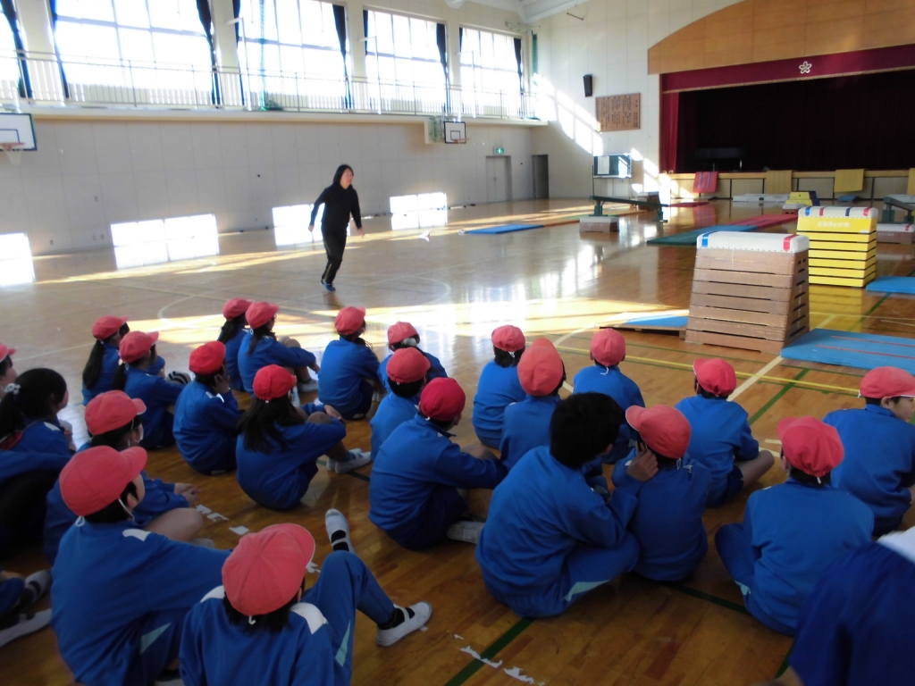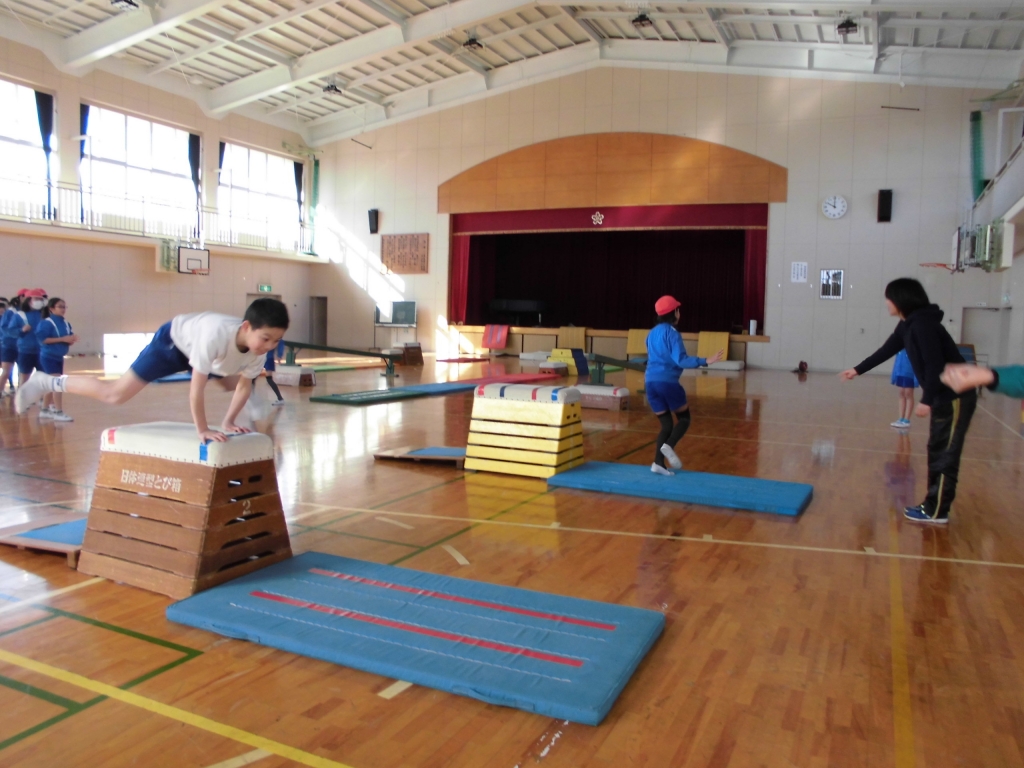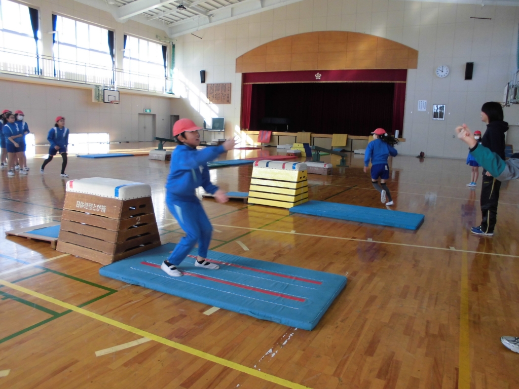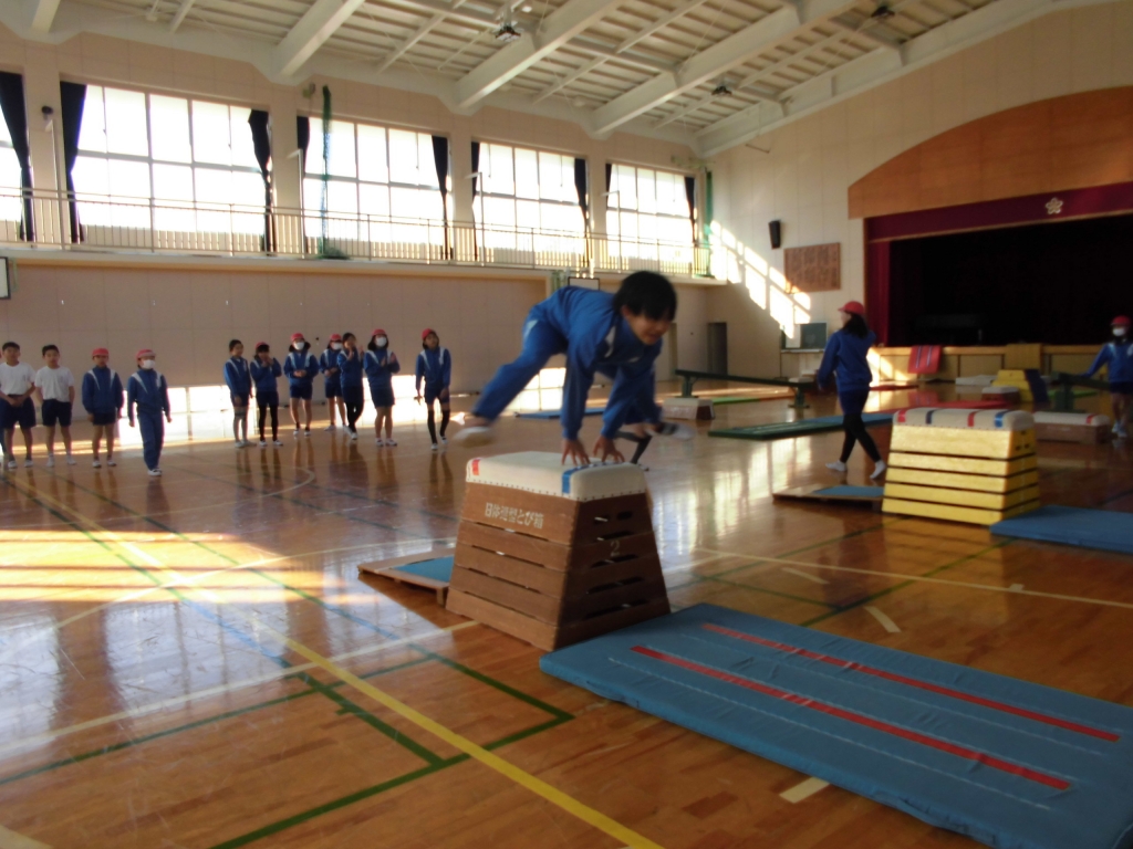 体育授業で跳び箱の学習が始まりました。跳び箱サーキットに取り組み、アスリート事業の五十嵐さんと跳び箱じゃんけんに取り組みました。開脚跳びをしながら楽しくジャンケンをしていました。