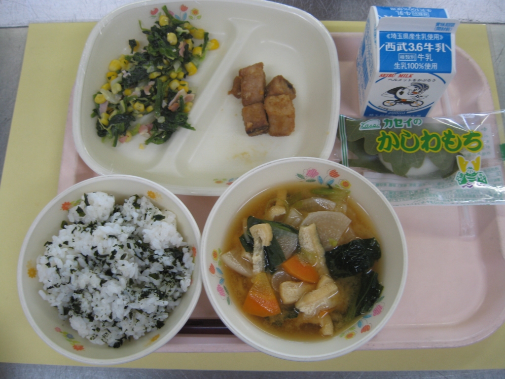 牛乳・わかめごはん・かつおの香り揚げ・ほうれん草とコーンのソテー・大根の味噌汁・柏餅
