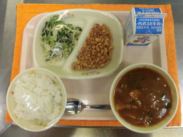 絵文字:食事 給食牛乳・小江戸カレー・大豆のカリカリ揚げ・野菜のゴママヨネーズ和え絵文字:食事 給食