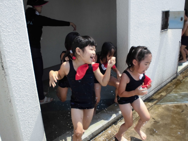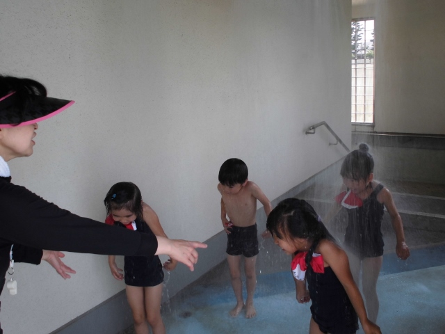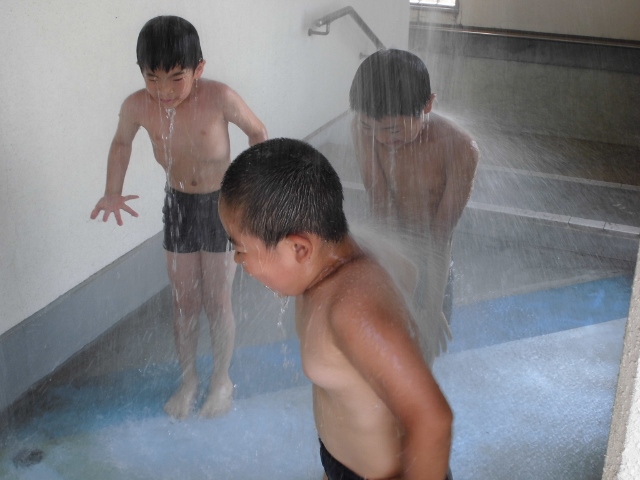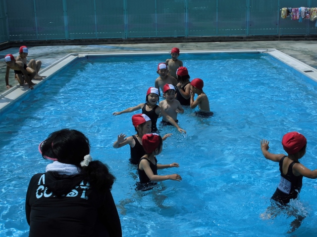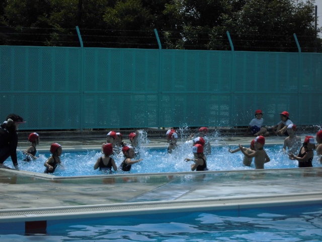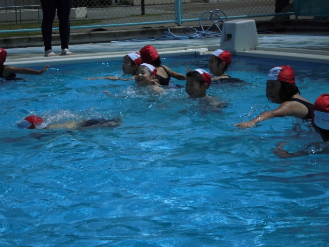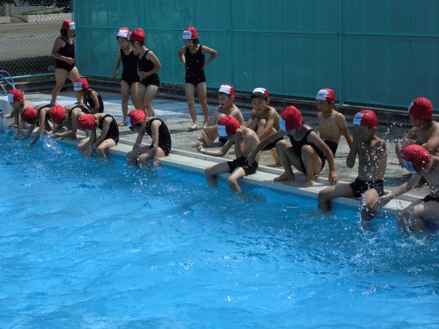 15日(月)、梅雨の時期ですが、今日は強い日差しのもと、水泳学習をすることができました。水に入っている1年生も気持ちよさそうに水遊びをすることができました。「今日、初めてもぐることができたよ。」とうれしそうに声をかけてくれた児童もいました。これからどんどん水に入り、上手に泳げるようがんばってください。