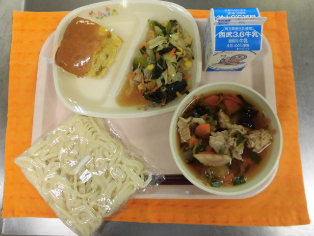 牛乳・肉うどん・小松菜とジャコの炒り煮・カボチャのパンケーキ