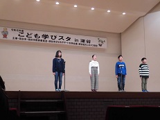 昨日の8日(日)は時代の深谷を担う自覚を持った子どもたちを育成するために、子どもたちのがんばりを地域の大人が再確認し、青少年の健全育成につなげることをコンセプトに深谷市民文化会館にて「こども学びスタin深谷」が行われました。ステージでは私の「深谷の子 6つの誓い」では6年の萩原怜さんが6つの誓い「勉強」についして発表しました。子どもの暗唱を楽しむ会では6年の笠越智裕さん松井慧太さん矢島苺果さん四方田まりあさんによる「注文の多い料理店」の作品の暗唱を発表しました。