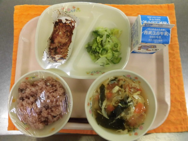 3学期最後の給食です。お祝いに赤飯を出しました。もち米のモチモチとした食感とあずきのほのかな甘みがとても美味しかったです。赤飯がもりもり食べられる様に韓国風鶏の照り焼きにしました。醤油の香ばしさとトウバンジャンの香辛料が食欲をそそりました。かき玉汁とグリーンサラダはさっぱりと仕上げました。