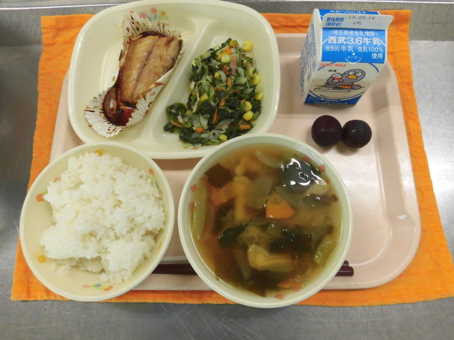 絵文字:食事 給食牛乳・ごはん・サバの生姜焼き・ほうれん草とコーンのソテー・味噌汁・巨峰絵文字:食事 給食
