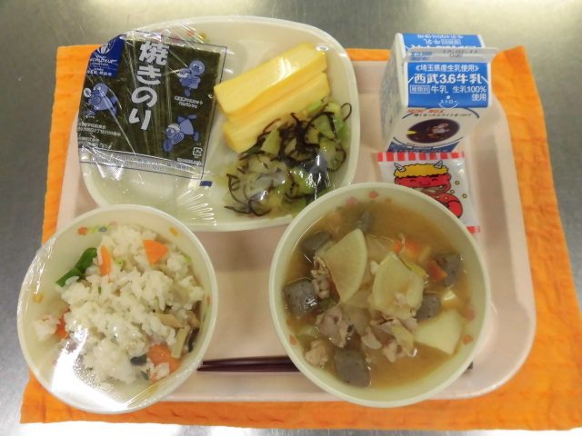 牛乳・かてめしで恵方巻き・厚焼き卵・塩こんキャベツ・豚汁・福豆