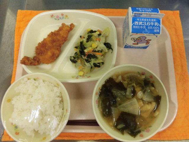 絵文字:食事 給食牛乳・カツ丼・小松菜とジャコの炒り煮・大根とアサリの味噌汁絵文字:食事 給食