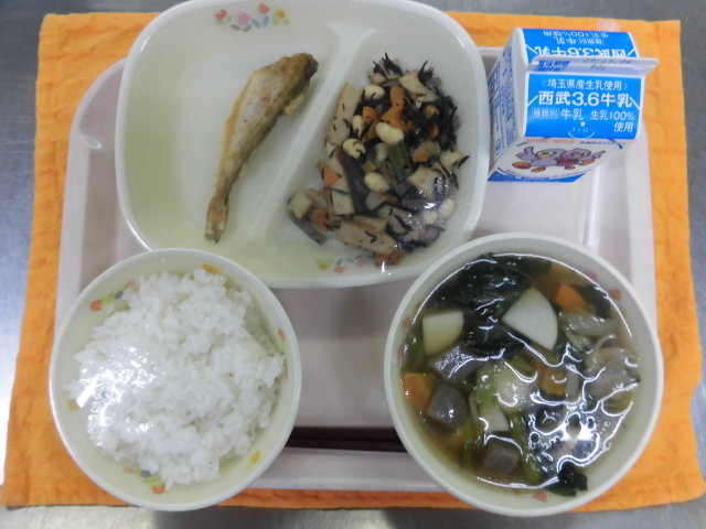 絵文字:食事 給食牛乳・ごはん・はたはたの唐揚げ・大豆の磯煮・だまっこ鍋絵文字:食事 給食