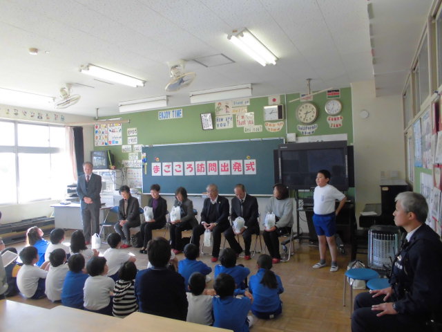 お年寄りの方に届けていただくため、地区の民生児童委員の皆様に花と作文を託しました。今日はその出発式でした。子どもたちが世話をした花と手紙で、いつまでもお元気でいてください。