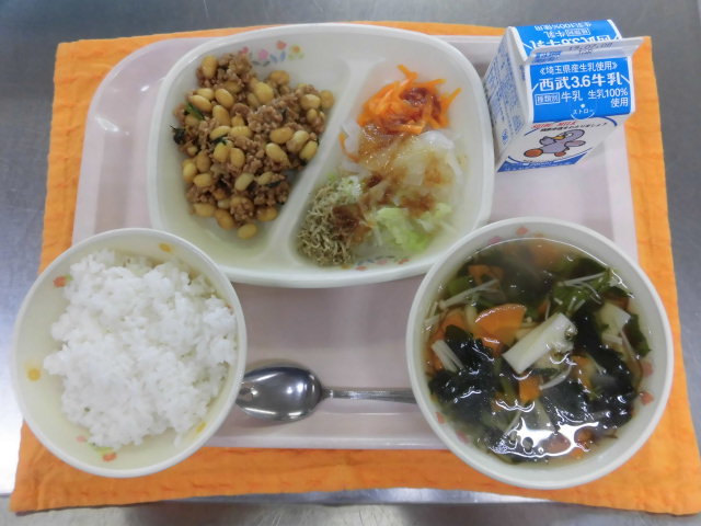 大豆がたくさん入ったソイ丼です。大豆は炭水化物やカルシウム、鉄など様々な栄養素をもっています。子供達が好むカレー味にして食べやすく調味をしています。大根とジャコのサラダは、ジャコをゴマ油で炒めて風味を出しています。