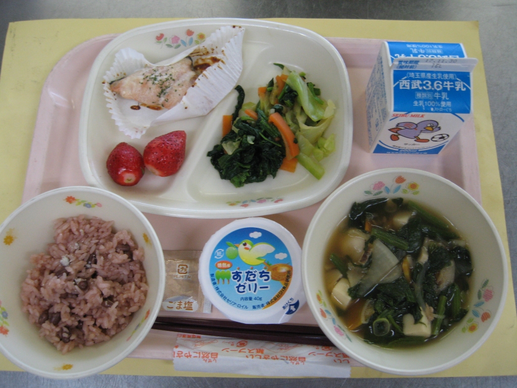 牛乳・赤飯・鮭の明太マヨネーズ焼き・おひたし・沢煮椀・すだちゼリー・イチゴ