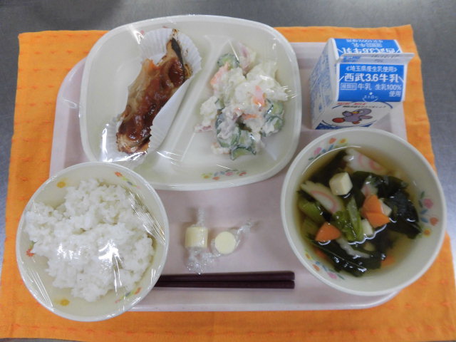 牛乳・ごはん・鮭のチャンチャン焼き・ポテトサラダ・すまし汁・チーズで鉄分