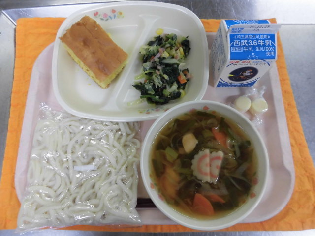 絵文字:食事 給食牛乳・深谷ネギたっぷりうどん・カボチャパンケーキ・ほうれん草とコーンのソテー・チーズで鉄分絵文字:食事 給食
