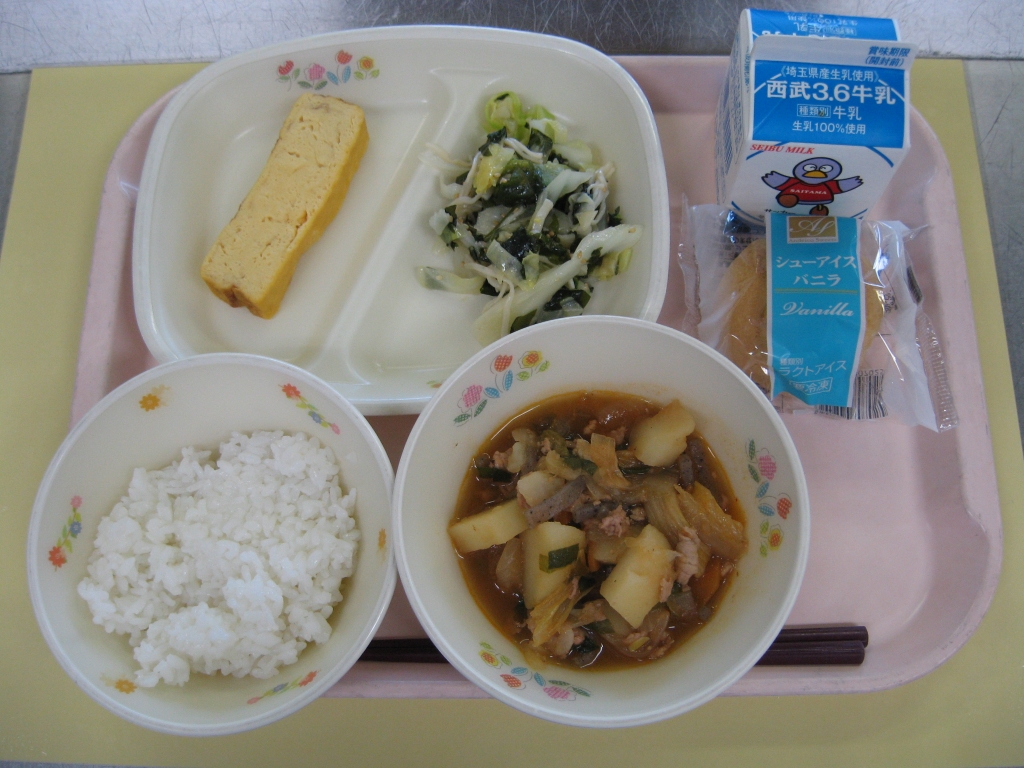 牛乳・ごはん・ジャガ豚キムチ・和風サラダ・厚焼き卵・シューアイス