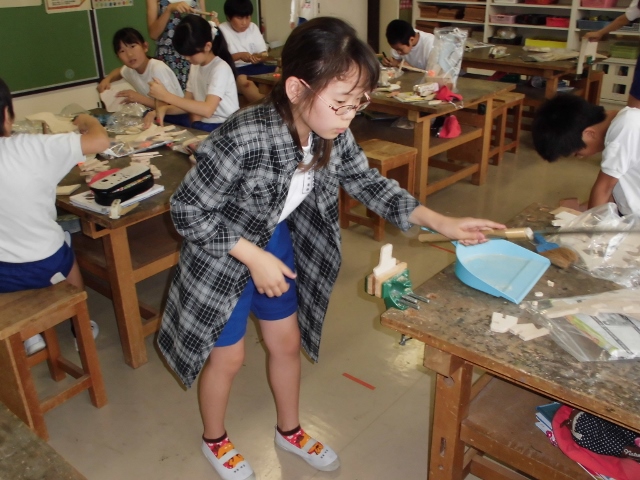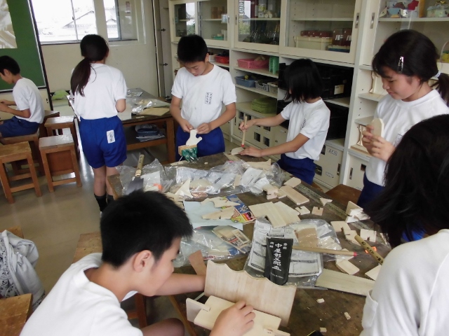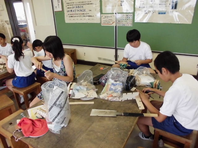 6年生が図工で「組み木パズル」を造っていました。慣れない手つきでのこぎりやきりを使って木を思い思いの形に切っていました。完成したパズルが楽しみです。