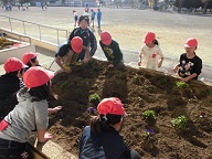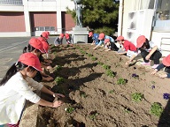 1回目は「人権の花」の球根を学校花檀に植えました。髙田先生の説明を聞き、一人3~4個植えました。