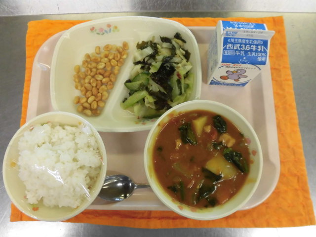 牛乳・スピナッチカレー・海草サラダ・大豆のカリカリ揚げ