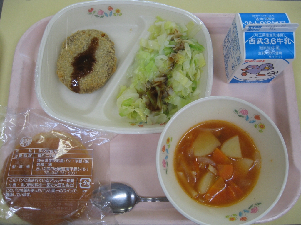 牛乳・メンチカツサンド・茹でキャベツ・ミネストローネ