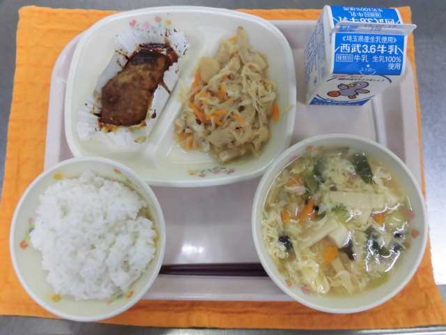 脂ののったサバのソース焼きです。ウスターソースと砂糖と味噌で調味をしています。切り干し大根は子供達が好むように甘めに味付けをして、しっかり味を染みこませています。サンラータンは酢が入った酸味のあるスープです。たけのこや人参、豆腐など具材もたくさんあって食べ応えのあるスープです。