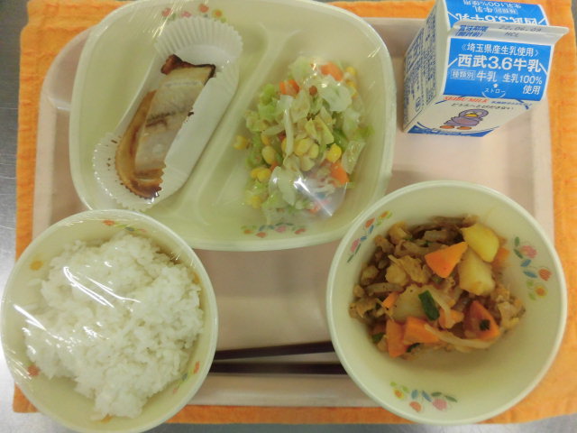 絵文字:食事 給食牛乳・ごはん・サワラのみそマヨネーズ焼き・じゃが豚キムチ・たくあんサラダ絵文字:食事 給食