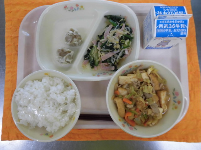 牛乳・ごはん・厚揚げのチャオサイ・しゅうまい・もやしのナムル