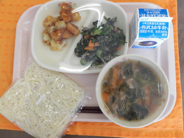 牛乳・もやしラーメン・みそポテト・ほうれん草とひじきのサラダ