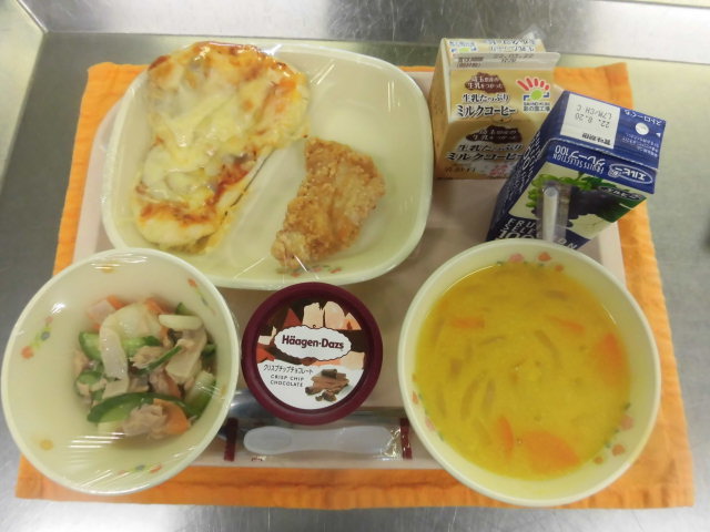 絵文字:食事 給食コーヒー牛乳・ブドウジュース(セレクト)・唐揚げ・ツナと野菜のミックスサラダ・豆乳パンプキンスープ・ピザ・アイス絵文字:食事 給食