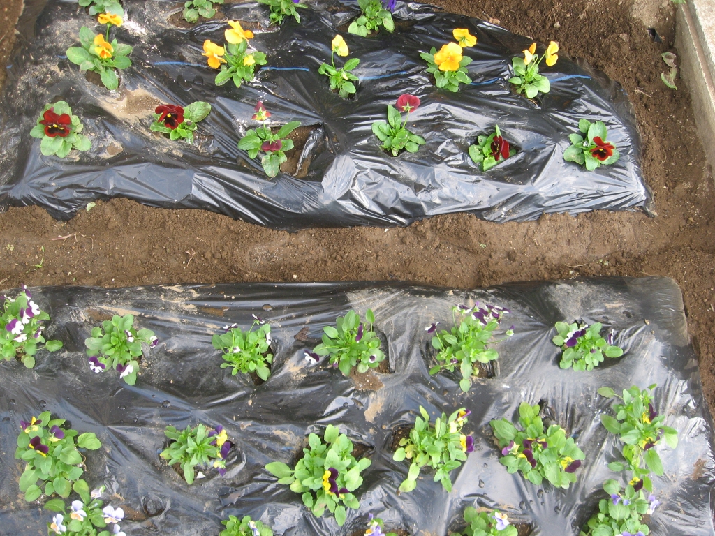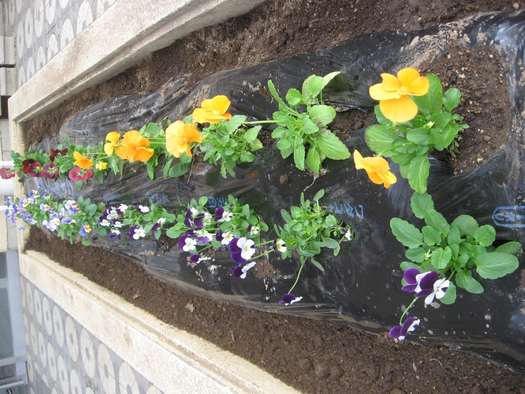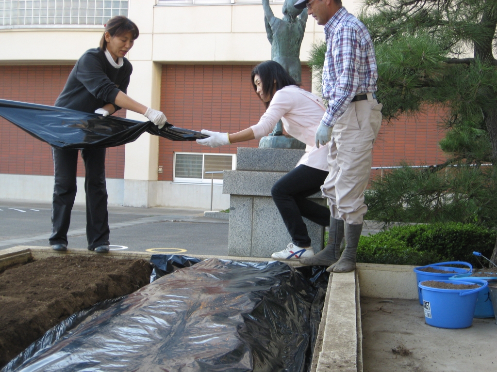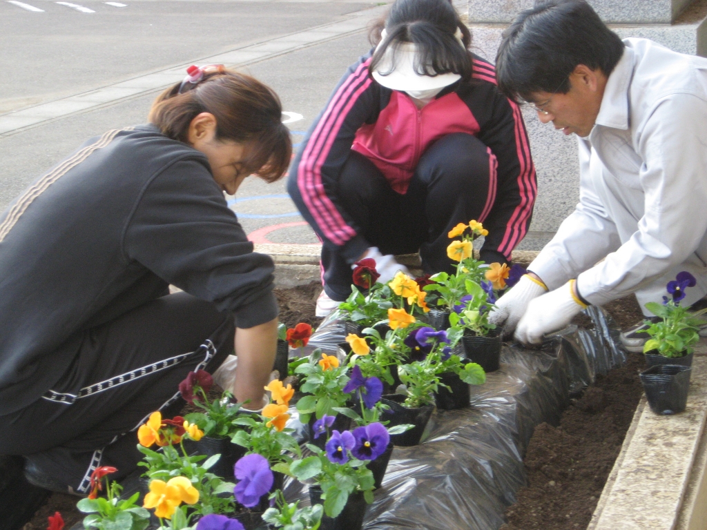 10月30日に、花壇の植えかえでパンジー、ビオラの苗を、学校支援ボランティアの森田さんの指導のもと、職員作業で行いました。