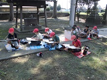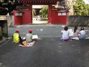 4年生が郷土を描く美術展に作品を出品するため、近くの神社に写生会に行きました。本殿を描く子、鳥居を描く子、鐘撞き堂を描く子など自分のイメージにあった場所でそれぞれが挑戦していました。この後、学校に戻って色つけをし、完成です。