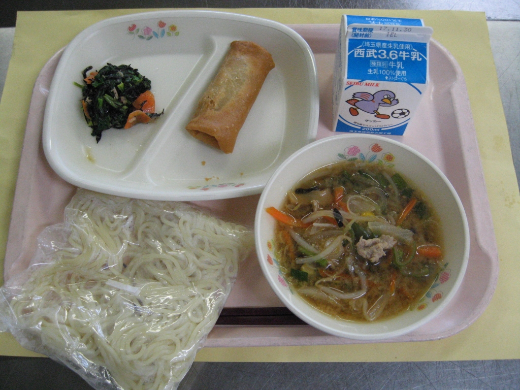牛乳・ごまみそラーメン・春巻き・ほうれん草とひじきのサラダ