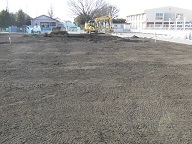 元大寄幼稚園の跡地の芝生化工事が着実に進んでいます。1月に工事開始し、現在は黒土を入れ植栽基盤づくりの校庭中です。このあと芝張りが予定されており3月末には工事終了となっています。その後は養生などし、状況にもよりますが使用できるのは6月くらいでしょうか。学習場所としての活用を中心に考えています。