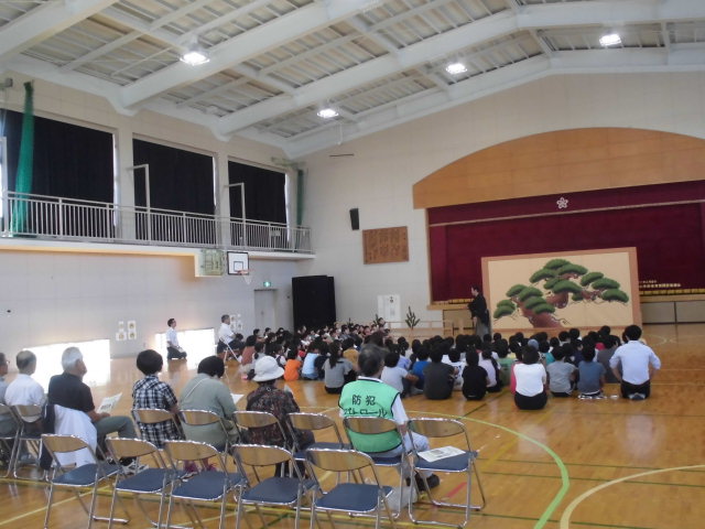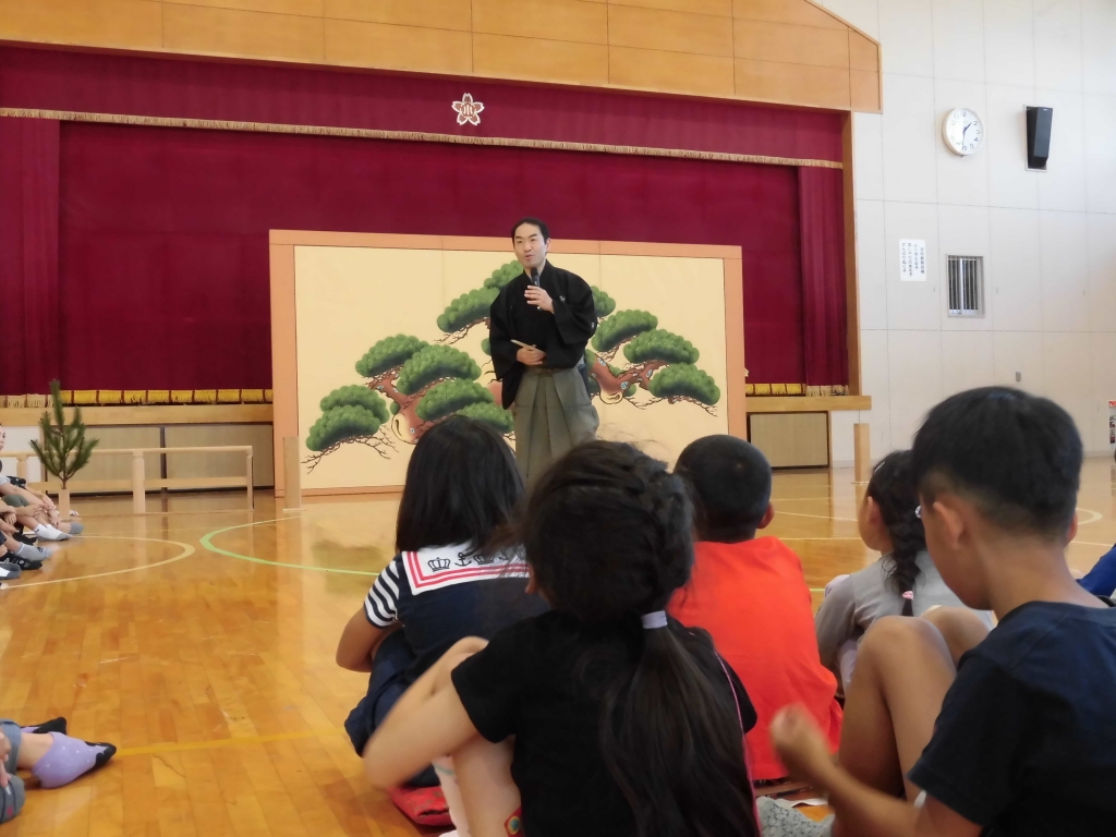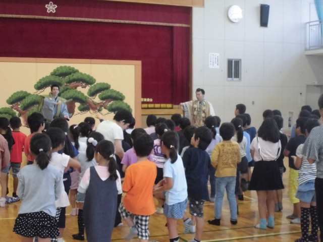 【共演体験 狂言「蝸牛」】児童は、「雨も風も吹かぬに でざかまうちわろ でざかまうちわろ」と太郎冠者になって大きな声で山伏を囃しました。最後に「狂言だけでなく、いろいろな体験をしていってください」と励ましのお言葉をいただきました。「万作の会」のみなさん、本日はあがとうございました。