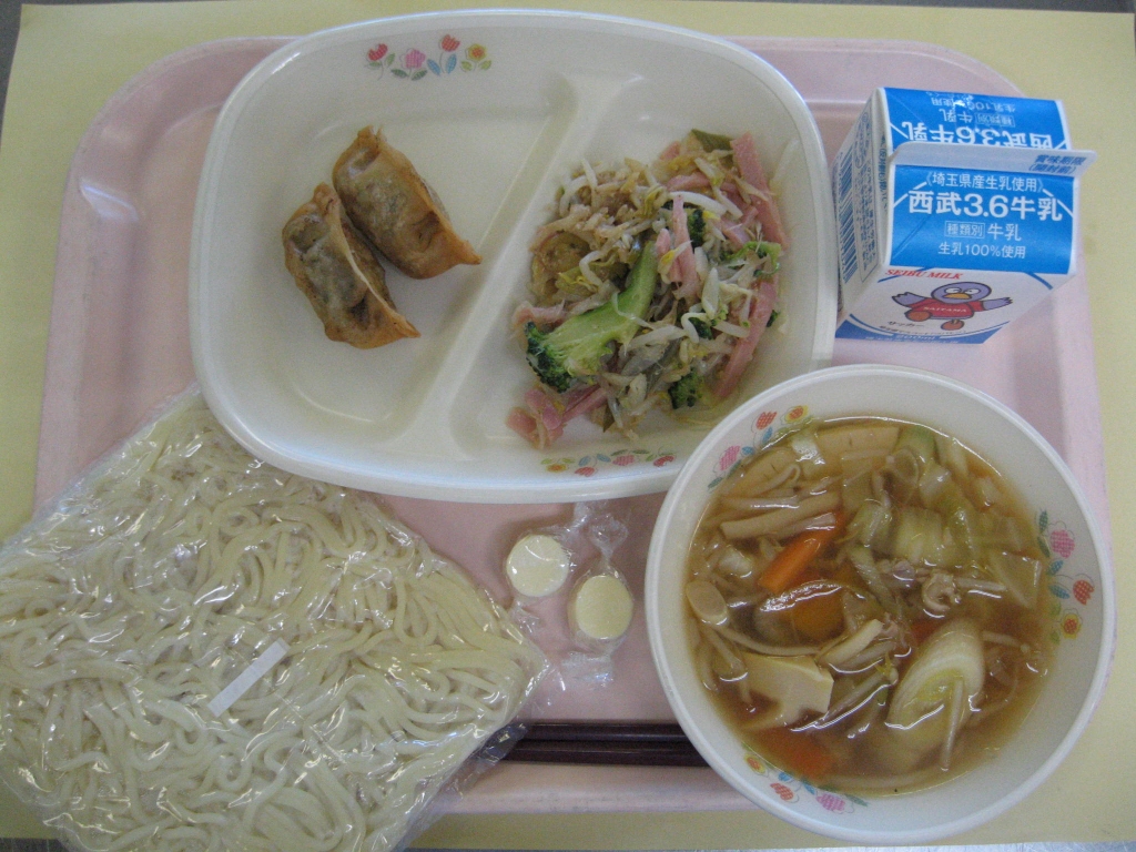 牛乳・サンマーメン・揚げ餃子・ブロッコリーとネギのナムル・チーズで鉄分