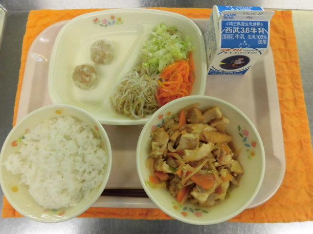 絵文字:食事 給食牛乳・ごはん・生揚げのチャオサイ・しゅうまい・中華サラダ絵文字:食事 給食