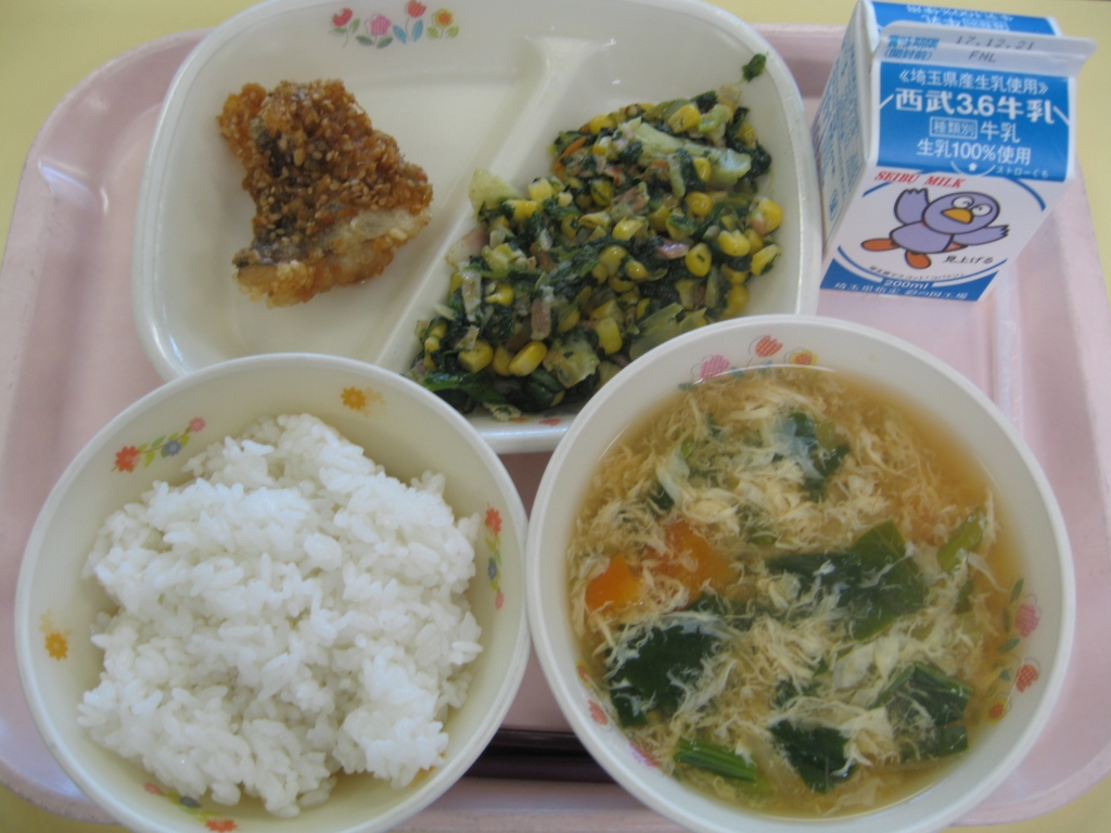 牛乳・ごはん・白身魚の南蛮漬け・ほうれん草とコーンのソテー・かき玉汁