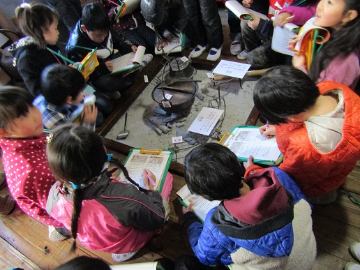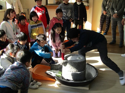 石臼体験では、大寄米を石臼を使い、粉にしました。ペアになり協力して行いました。