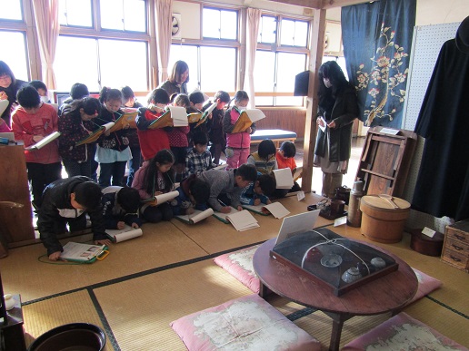 高崎市歴史民俗資料館では、昔使われていた道具の説明や農具体験、石臼体験をしました。