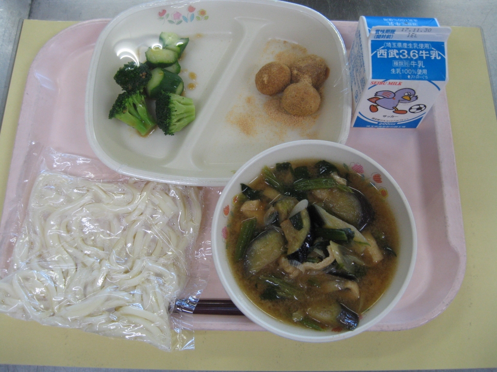 ◎牛乳・田舎うどん・白玉団子のきな粉和え・サラダ・チーズで鉄分