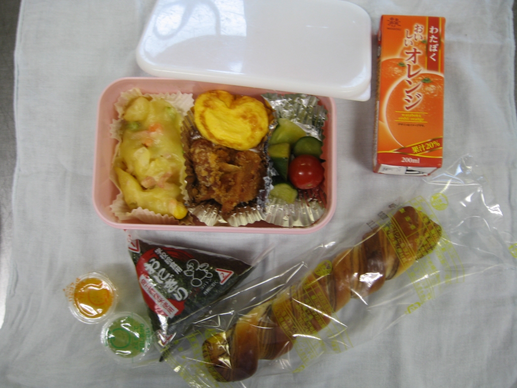 オレンジジュース・茶飯のおにぎり・スティックチョコ・唐揚げ・ハートオムレツ・カラフルポテト・きゅうりとトマト・ミニゼリー