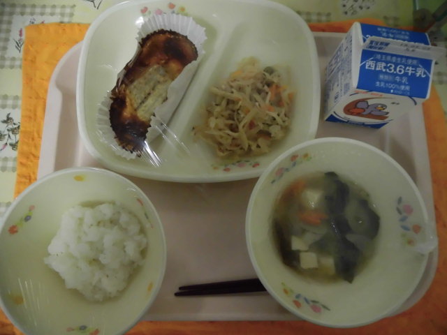 牛乳・ごはん・鱈の味噌マヨネーズ焼き・切り干し大根の炒り煮・野菜椀
