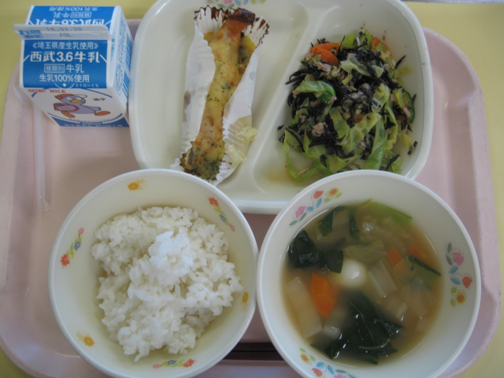 牛乳・ごはん・鮭のマヨネーズ焼き・ツナとひじきのサラダ・お雑煮
