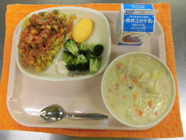 今日から給食週間です。本日は第1弾の姉妹都市給食です。深谷市の姉妹都市でもあるフリーモント市のジャンバラヤを出しました。ドライカレーにケチャップで味付けをした具材をのせて食べます。子供達にも人気のメニューです。
