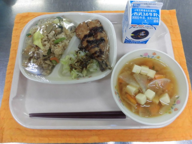 絵文字:食事 給食牛乳・秋の香りご飯・イワシの竜田揚げ・ゆでキャベツ・味噌汁絵文字:食事 給食
